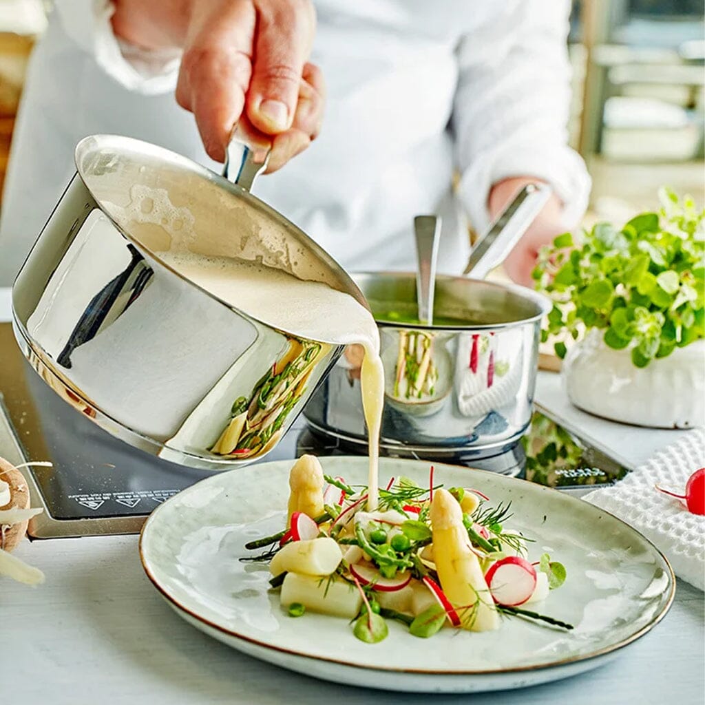 This beautifully polished saucepan is made of high-quality stainless steel and has a 3-layer base of 3.5 mm thick, which ensures excellent heat distribution. Suitable for all hobs, including induction, and ovenproof - ideal for both cooking and keeping your sauce warm. Thanks to the practical pouring rim, you can pour the sauce directly onto your dish without spilling. This small pan offers big benefits and is an elegant, functional addition to any kitchen.